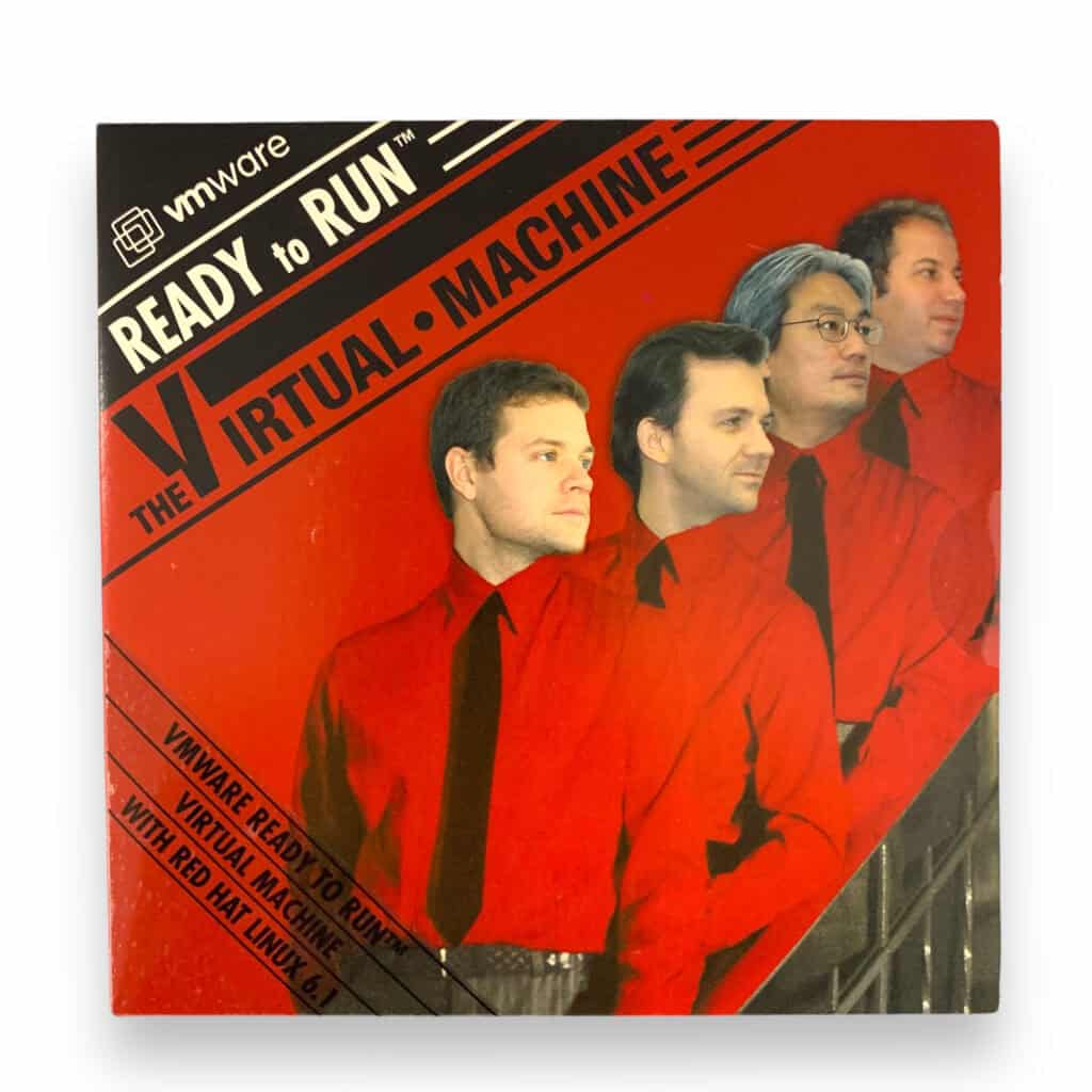The front cover of VMware Ready to Run Virtual Machine software CDs with a photograph of company founders, 2000. Catalog number 102801286.