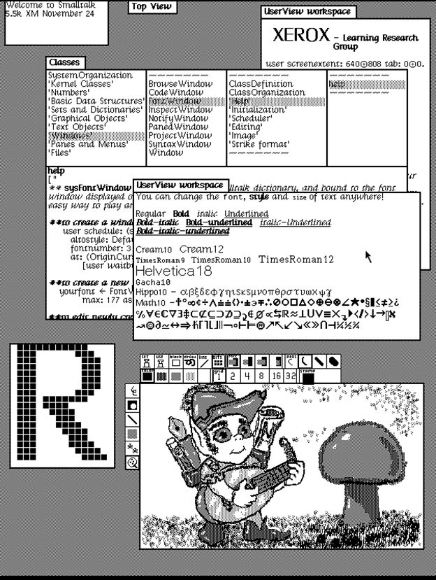 Over its almost 50-year history, there have been many versions of Smalltalk, many of which have had significant impacts on the wider computer industry. From today's perspective, in which mice and graphical user interfaces are ubiquitous, it can be difficult to imagine how radical the GUI was back in the 1970s. In addition, early PARC GUIs differed in key ways from the user interfaces we use today, be they Windows PCs or iPhones. For one, the dynamic, live nature of these systems, in which users were also programmers of their own systems and could change things immediately, at will, has been lost in favor of security and consistency. Text-based descriptions of these systems simply do not do them justice. They have to be seen. Recorded demos, such as those done by Ingalls and published by the Software History Center at CHM, do a much better job of capturing the experience.