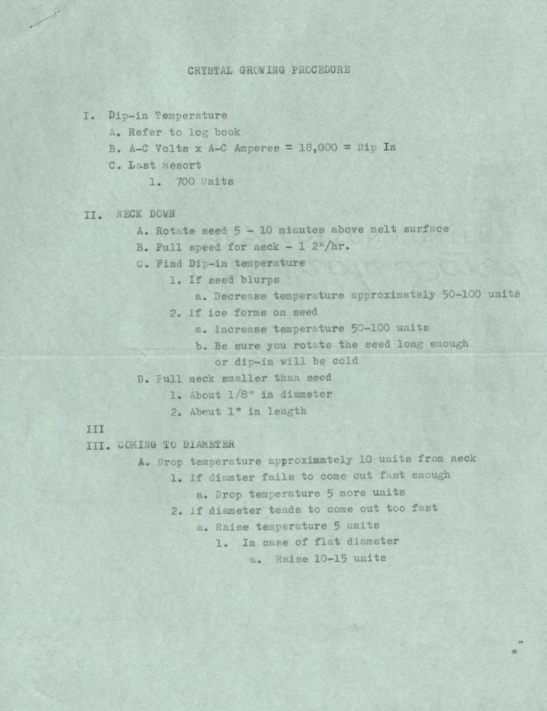 Anderson was not given a lot of formal training before she began pulling crystals. Two short memos laid out the fundamentals of crystal growing and the specific instructions for operating the equipment: “I’ve got the feeling that this is what I was handed, and I probably just watched somebody do it for a while. . . . I probably followed somebody around. I assume I just started doing it.”