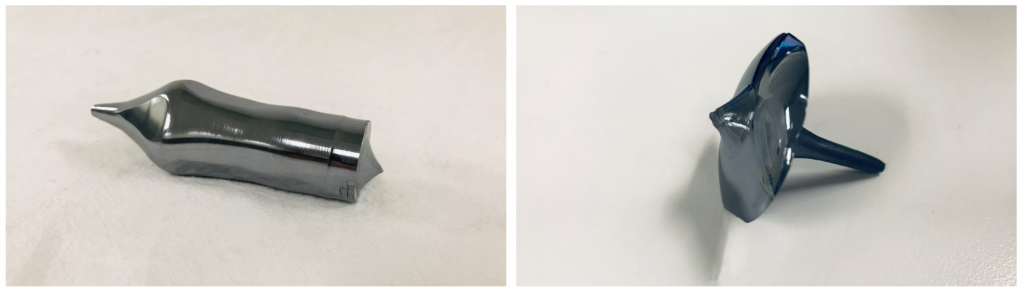 Crystal growing was a delicate process, highly sensitive to chemical, temperature, and mechanical effects. When a crystal went awry, many exotic shapes could result. Patricia Anderson kept a sampling of such reject crystals. Credit: Collection of CHM, 102806916 and 102806912