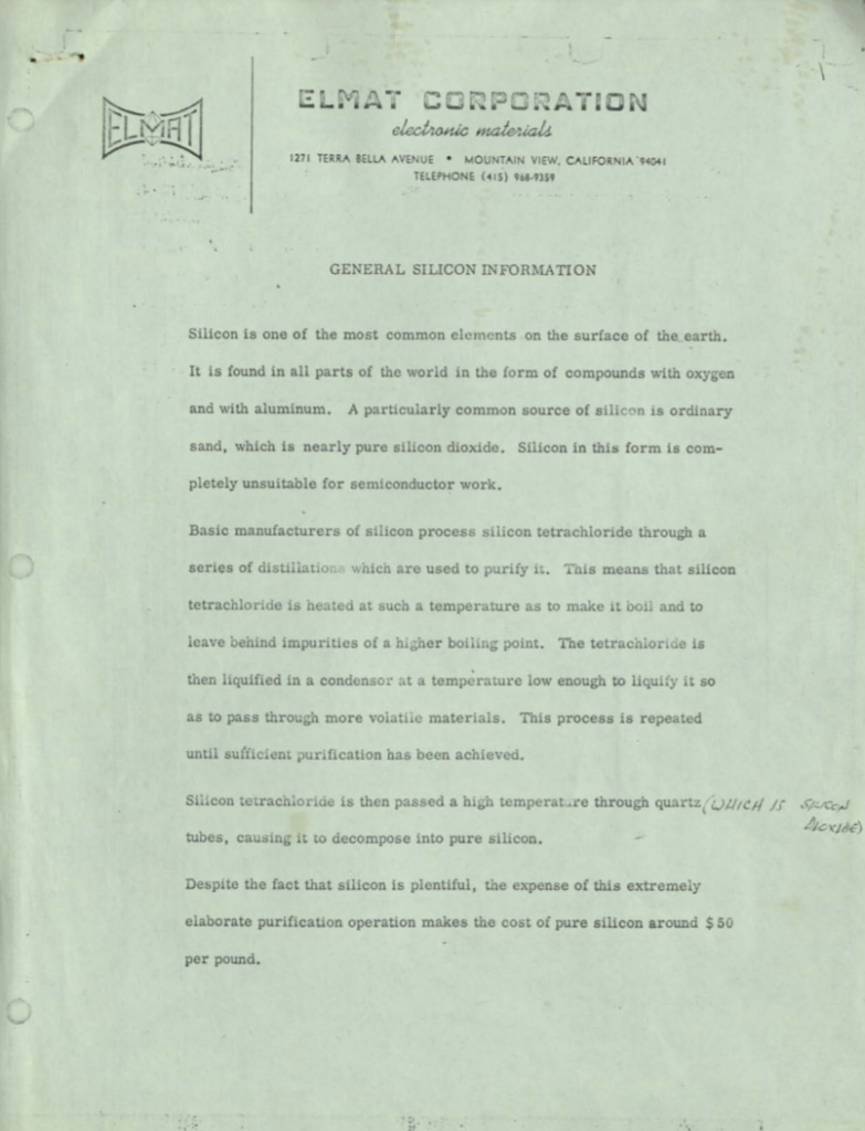 The beginning of a three-page memo, likely provided to new employees of Elmat, that lays out the basics of silicon crystal and wafer production. Credit: Collection of CHM, 102793121