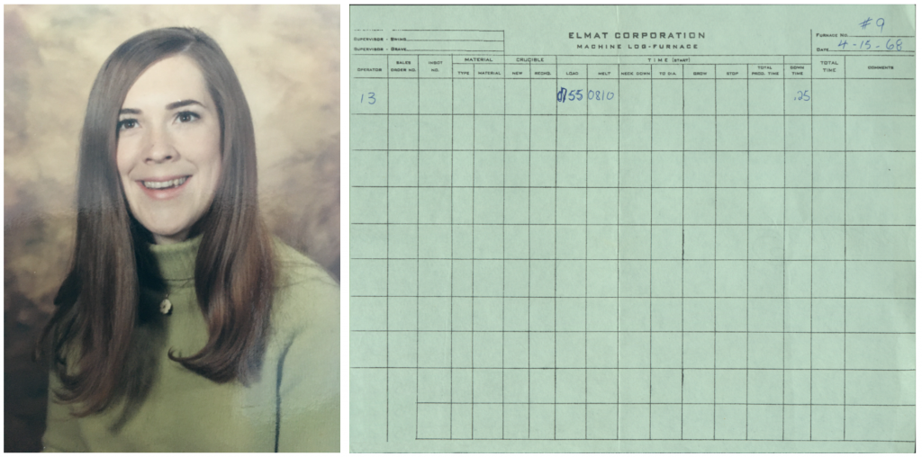 Left: Patricia Anderson in May 1971, during her second period working as a “crystal puller” for Elmat/Semimetals. Credit: Collection of CHM, 102792161; Right: Crystal growing operators were required to keep logs of their work on each of the various growing machines and their different results. This one dates from Patricia Anderson’s beginning work at Elmat/Semimetals. Credit: Collection of CHM, 102793123