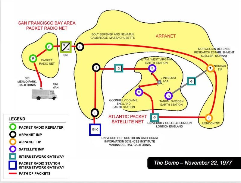 On a rainy Wednesday, November 22, 1977, all was ready. Data flowed seamlessly from the van to SRI in Menlo Park and the University of Southern California in Los Angeles via England, Boston, and Sweden across three types of networks: packet radio, the satellite network, and the ARPANET. All as the van cruised Bay Area roads. The internet was born. Sort of...