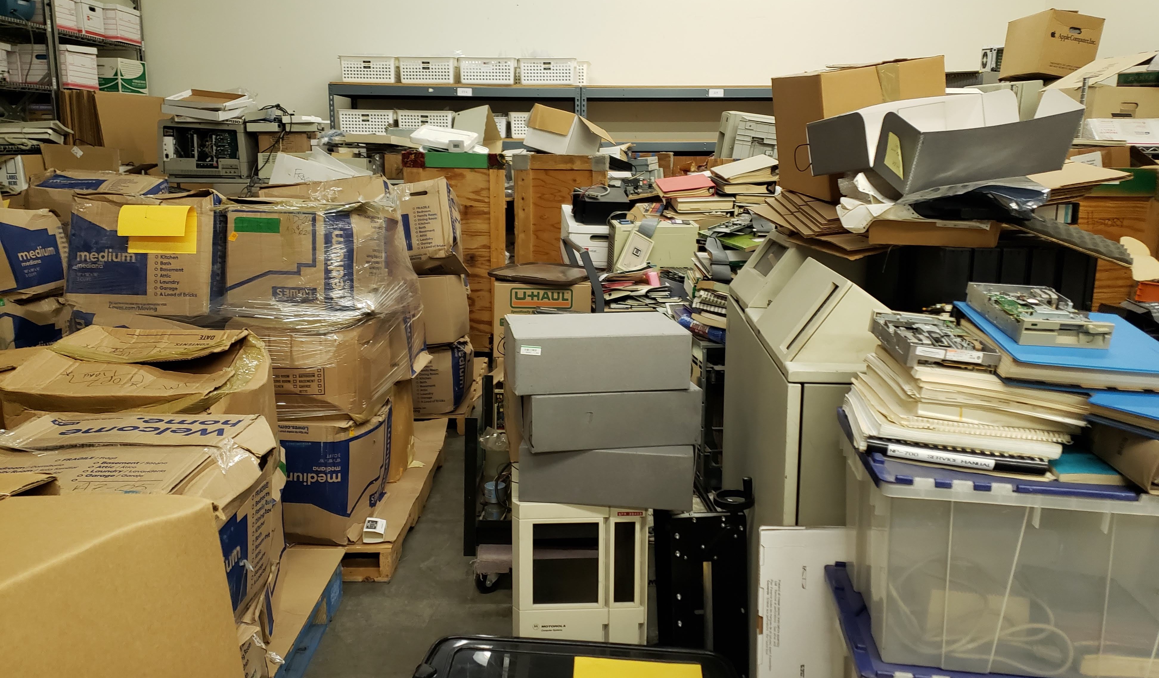 The first batch arrives at the CHM Shustek Research Archives after an epic journey. Here’s the rescued collection (boxes on left) in storage quarantine to check for pests.