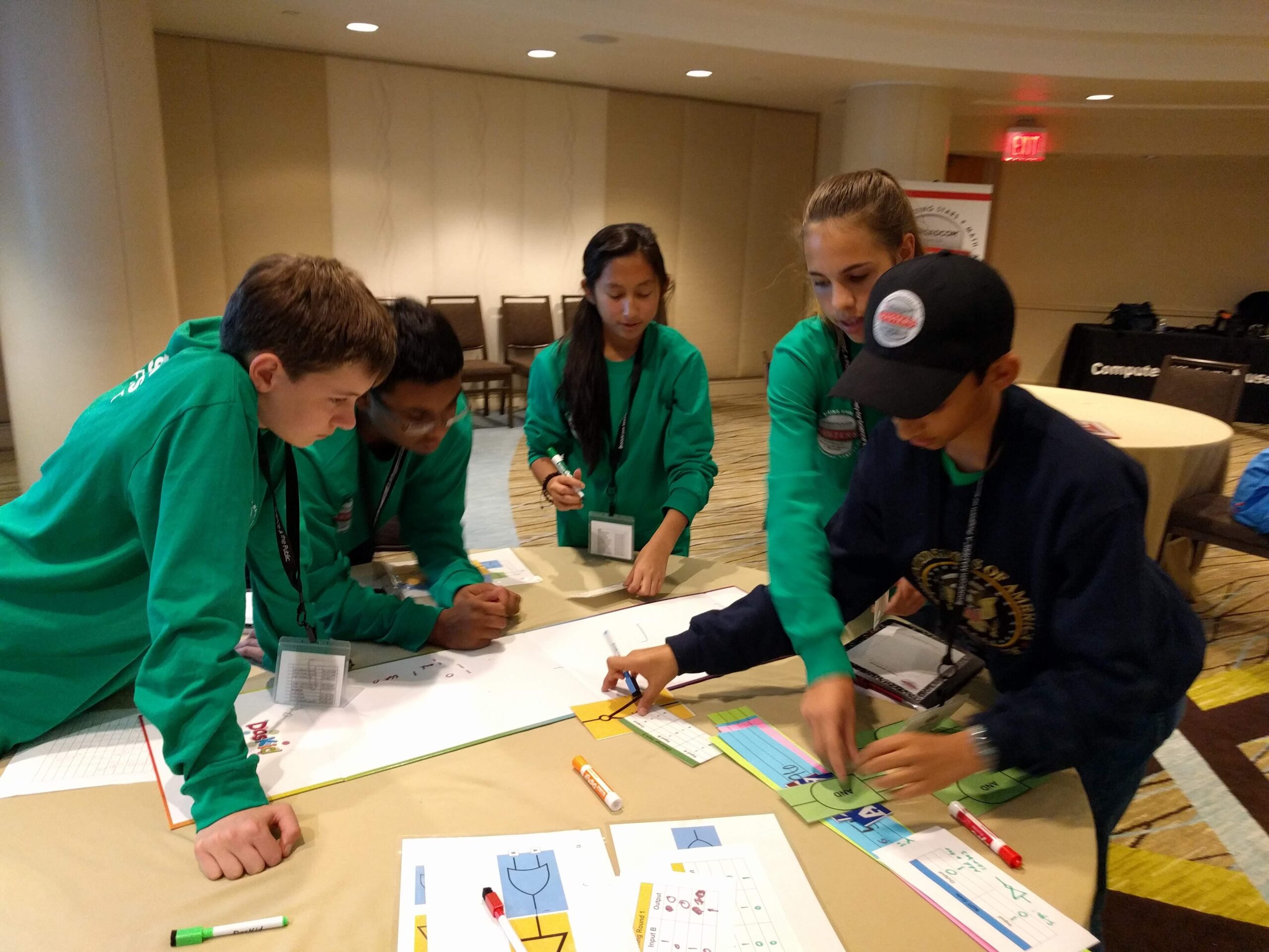In our Logic Gates Challenge, led by Corrigan, small teams worked together to familiarize themselves with the rules of Boolean algebra, completing a mini challenge where they arranged logic statements and created truth tables for each of the three main Boolean operators: AND, OR, and NOT. Students then learned how those operators create logic gates that control electricity and form basic computer architecture. Each group completed a main challenge where they designed systems that use combinations of the three main gates (AND, OR, and NOT) to match other truth tables.
