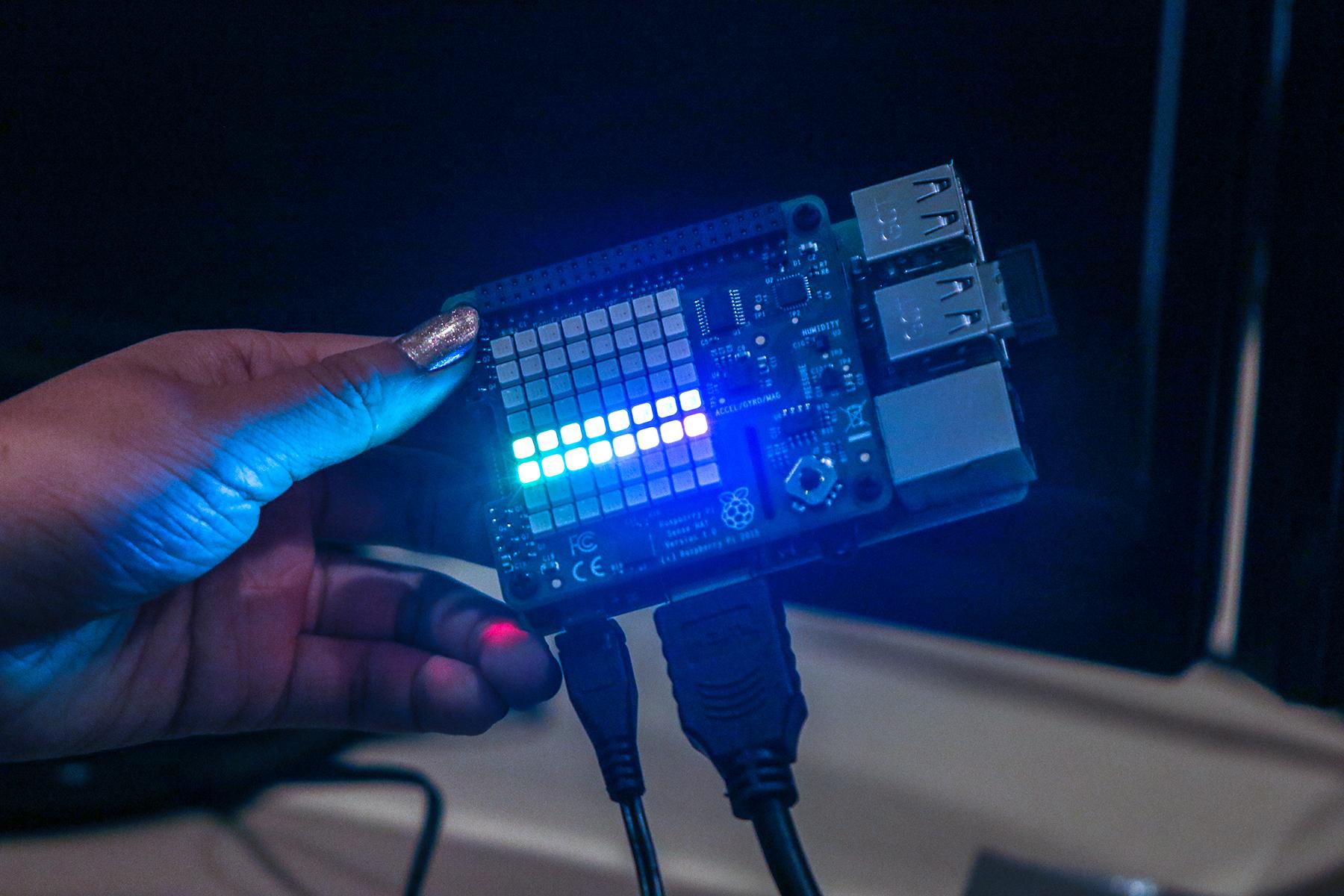 In our Raspberry Pi Challenge, led by McGregor, six teams of five students were challenged to design, code, and build a computer program to control the gyroscope (a feature of the SenseHat—a peripheral attachment to the Raspberry Pi) connected to a Raspberry Pi computer. The goal was to align the roll, pitch, and yaw (x, y and z axes) to fall within a designated range to trigger code that either a) displayed an image on the LED matrix when the goal was accomplished, or b) displayed the letter X when the axes were not within the desired range.