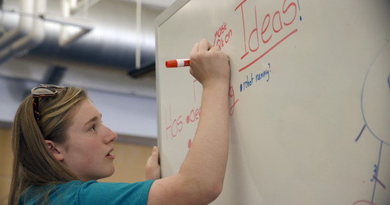 A Technovation Challenge finalist begins the brainstorming process, listing ideas, and features for her group’s robot during CHM’s Design the Future workshop.