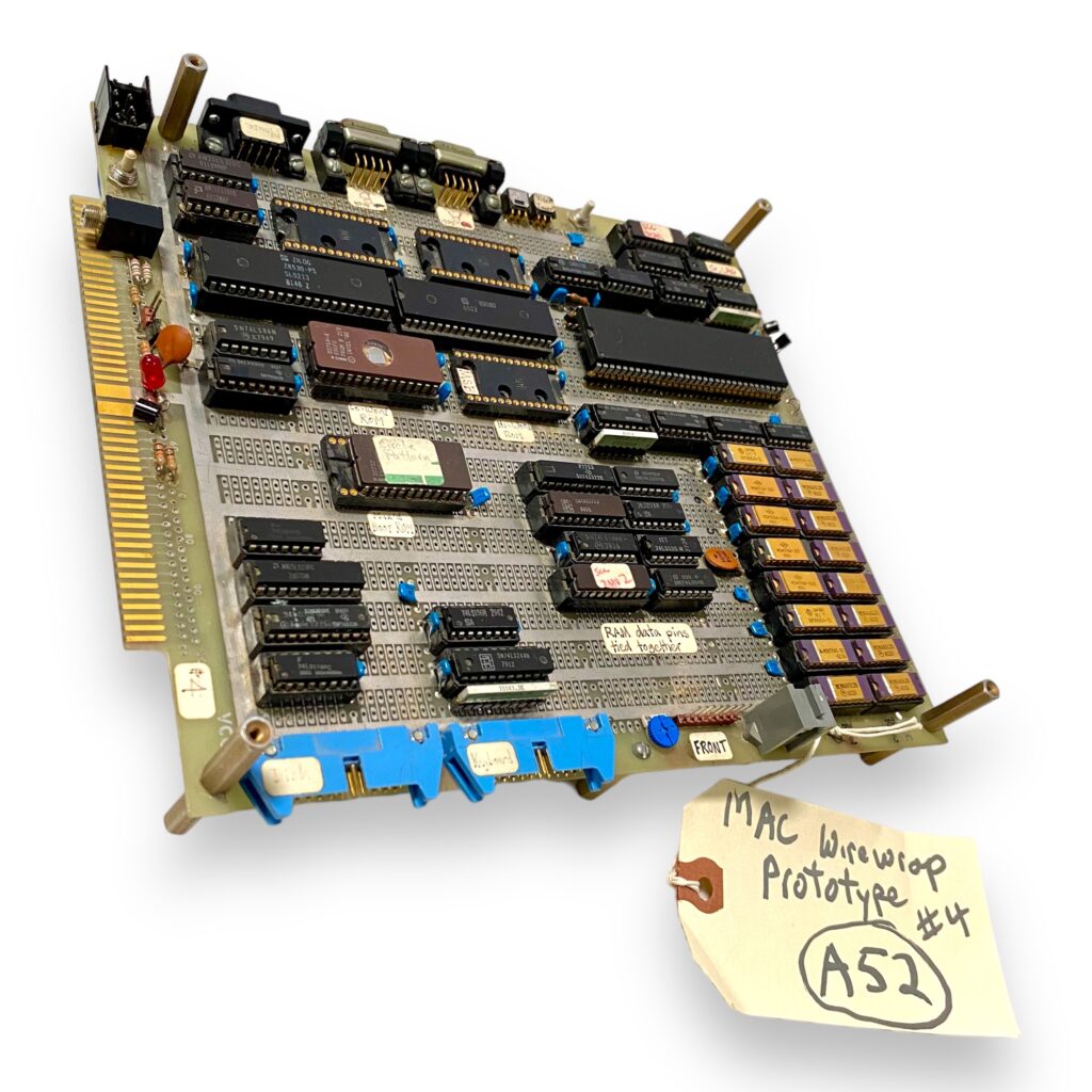 The evolution of Macintosh hardware began with wire-wrap prototypes built in the early 1980s by Apple employees Dan Kottke and Brian Howard. As the design changed throughout the development process, new versions were made. Shown here is Prototype #4.