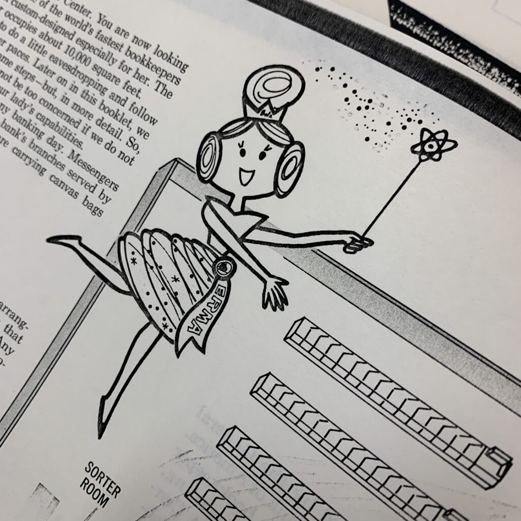 Main image: ERMA graphic from Bank of America publicity brochure, https://archive.computerhistory.org/resources/access/text/2023/04/102726943-05-01-acc.pdf