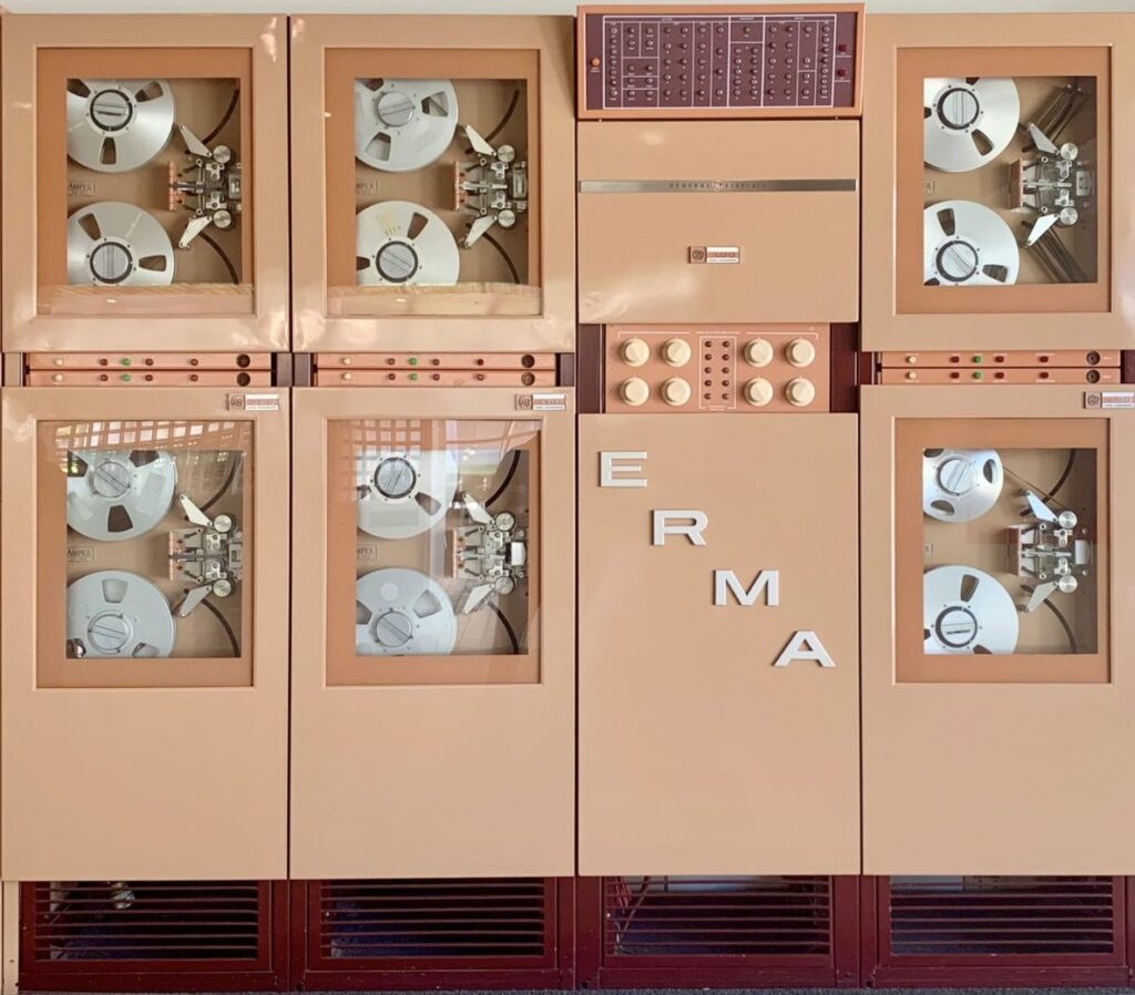 ERMA was designed and built in mid-century. Note the atomic and “space-age” themes. https://archive.computerhistory.org/resources/access/text/2023/04/102726943-05-01-acc.pdf