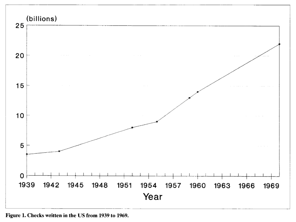 After WW II, a booming middle class placed huge demands on American banks. At Bank of America (BofA), checking accounts were growing at a rate of 23,000 per month and branches had to close every day at 2 or 3:00 p.m. to handle the paperwork for that day. Even as early as 1948, the bank was processing over two billion checks per year.