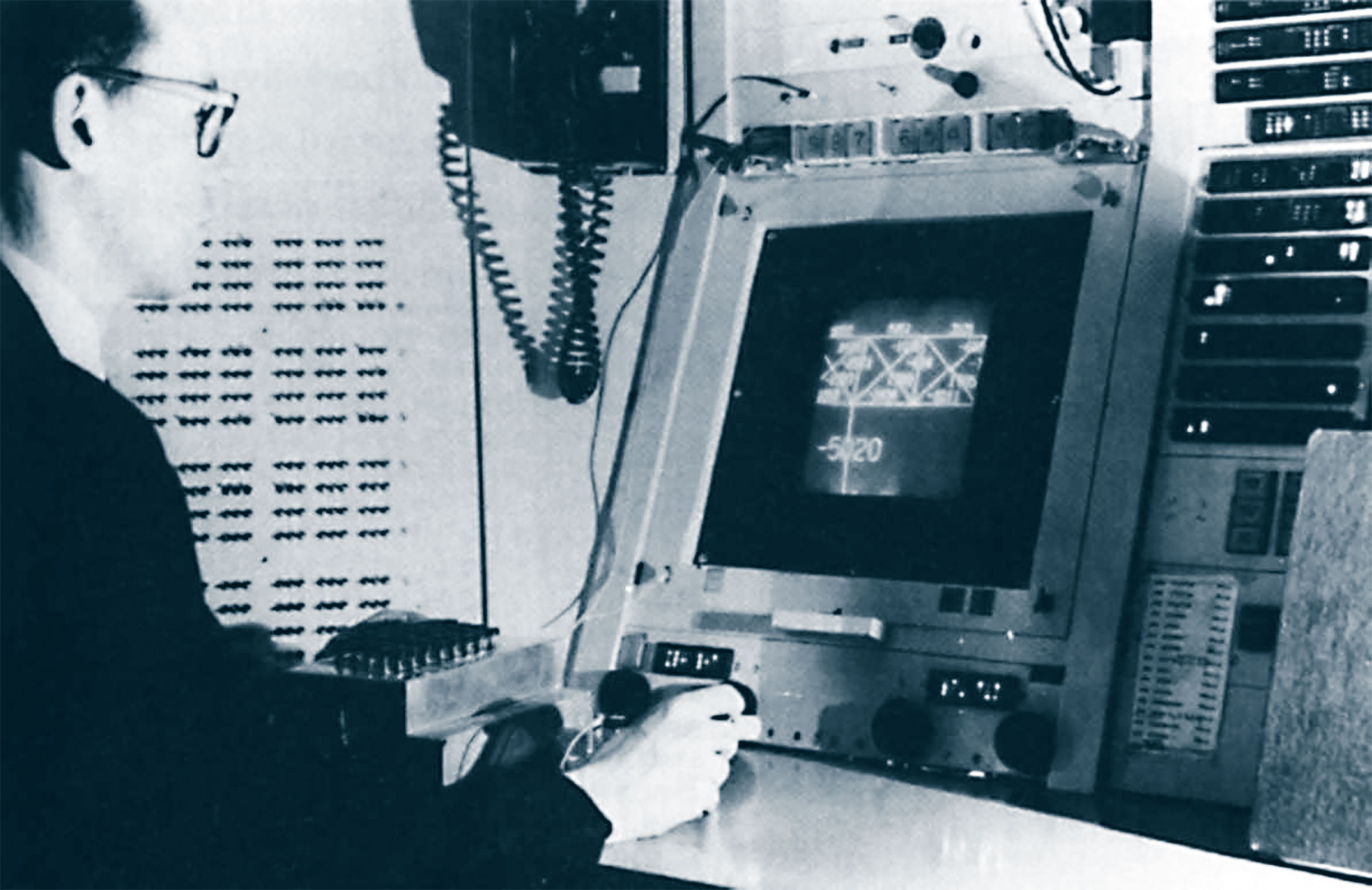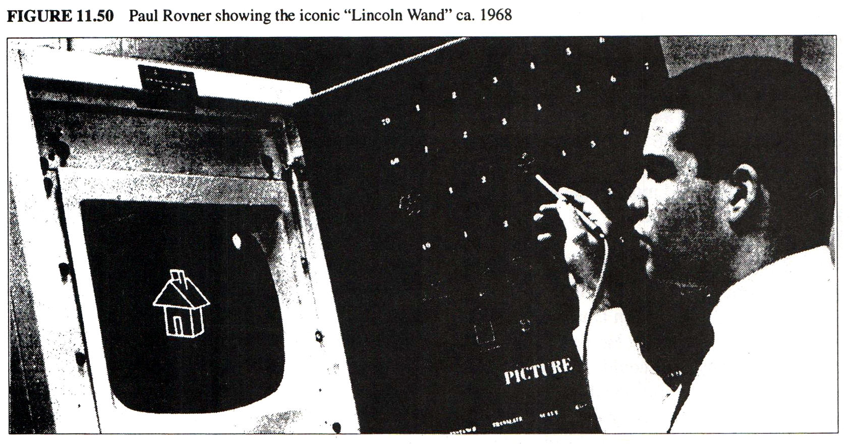 With his classmate Ivan Sutherland, he began using the machine to explore both graphics and alternate input devices. The Lincoln Wand, as they called it, was an ultrasonic pointing device that looked like a magic wand and could freely manipulate three dimensional virtual objects. A couple of years later, when Ivan began working on the first virtual reality helmet with input from Larry, the wand let you directly see whatever you were pointing to. But at the start it was already useful for manipulating objects on the screen, and a convenient way to define buttons anywhere within arm’s reach. You could paste a piece of paper on a nearby wall, and pointing to it with the wand would activate whatever function you had set up.