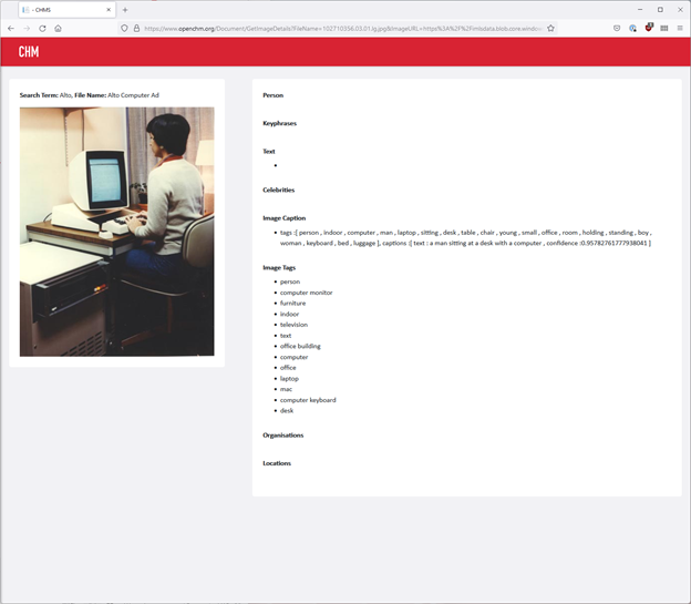 The metadata produced by the prototype for a photograph of a person using a Xerox Alto computer.
