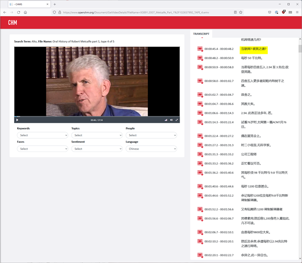 CHM’s grant was part of the IMLS’s National Leadership Grants for Museums and supported a one-year, rapid-prototype project to create a simple search portal for a selection of digitized materials from CHM’s collections—especially video-recorded oral histories—and the metadata about them generated by commercial machine learning services. Our thought was that by having internal staff and external user evaluations of this portal, we could assess the present utility and near-future potential of the various machine learning tools for ourselves and the community as well as gain first-hand experience with the actual use of these tools in practice.