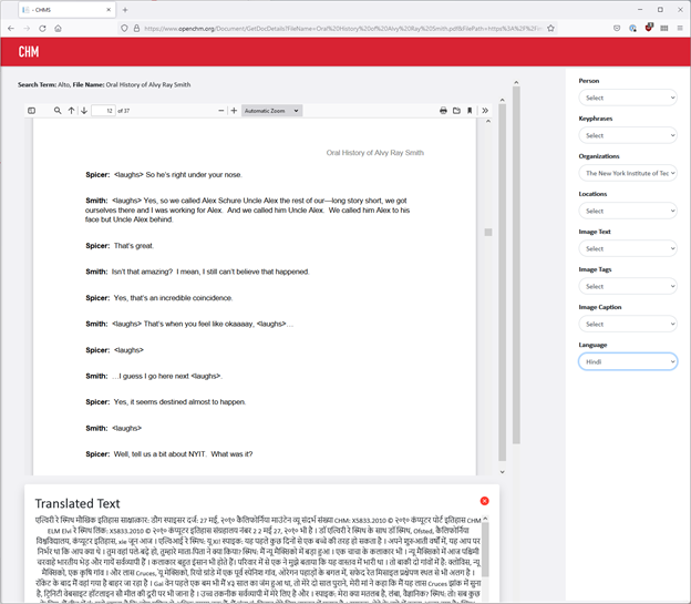 This image shows the automatic translation of a PDF of the transcription of graphics pioneer Alvy Ray Smith’s oral history into Hindi.