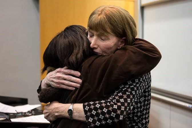 Grace Hsia, project manager and CoE alumnus, hugs Lynn Conway at the Own It Leading Inclusion: Gender In Engineering keynote event on November 18, 2014. Photo: Joseph Xu