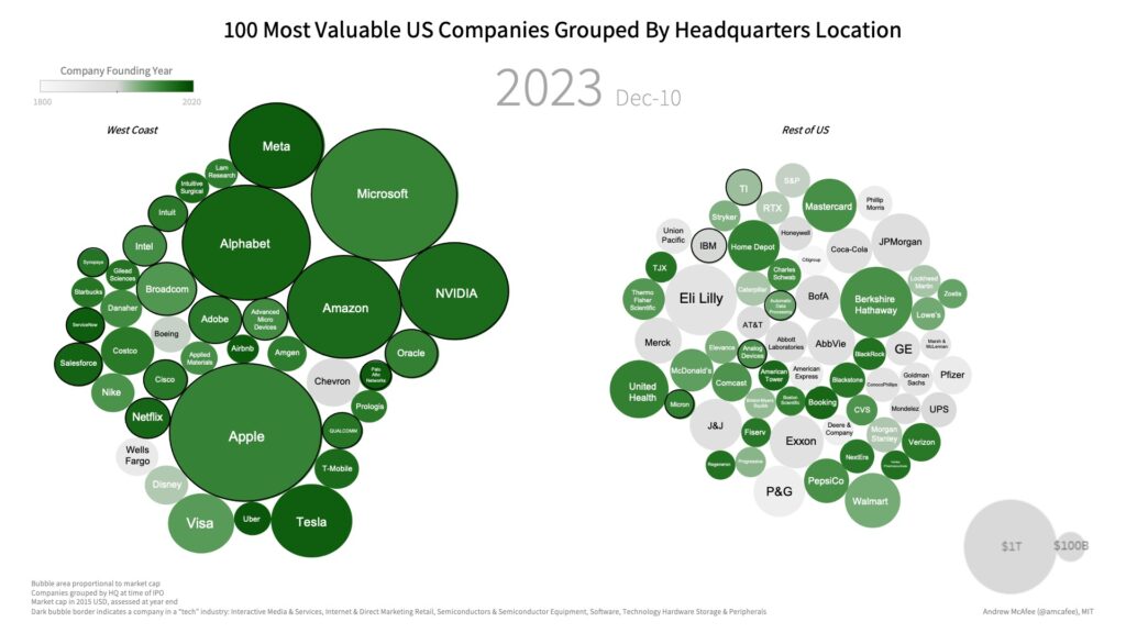 McAfee was inspired to write the book to explain what's been happening on the West Coast over the past 20 years. The region has grown to include nearly 60% of the 100 most valuable companies in the US, including Microsoft, Apple, Alphabet (Google’s parent company), Amazon, Meta (Facebook), and NVIDIA. They are younger and more tech-oriented than the industrial-era companies located in the rest of the country that used to dominate.