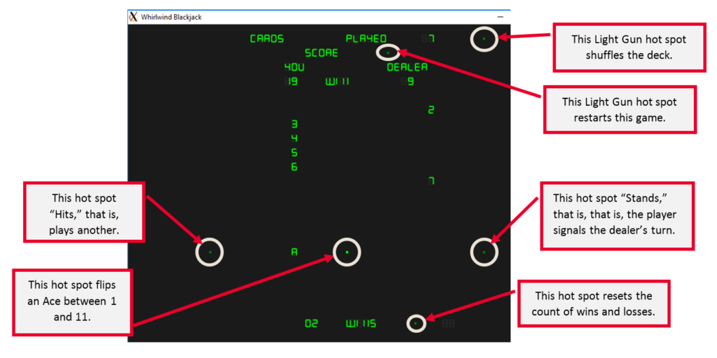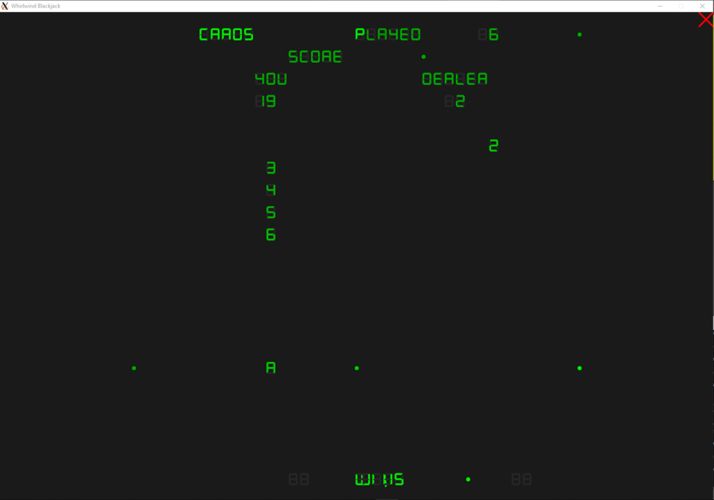 • The hardware has a character generator, which the Blackjack programmer used. Unfortunately, the character generator only generates seven-segment symbols. Digits are easy, but there are many letters that can’t be shown clearly on the seven-segment grid. So  WI II5 spells WINS, etc.