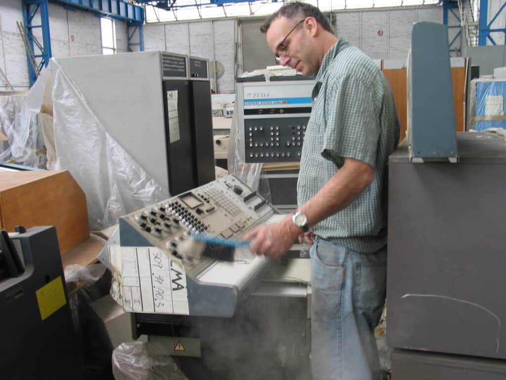 CHM Senior Curator Dag Spicer dusting off the control panel of an analog computer. Dag and fellow CHM curator Alex Bochannek were especially gratified to see several very important analog and analog/hybrid computer systems among the collection.