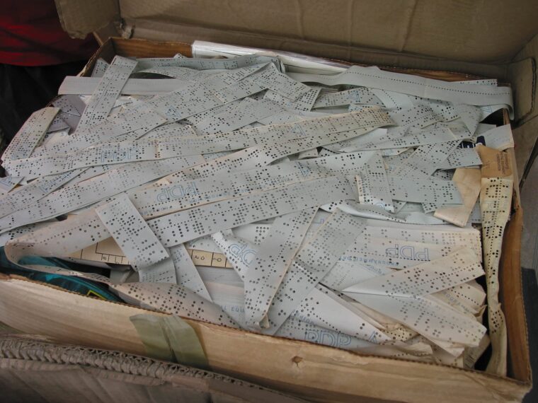 The first rows (A0–C13) mostly contained pallets stacked with documents and media. Despite occupying only 20% of the area, these items consumed nearly 40% of our time. Their condition ranged from water-damaged and moldy to surprisingly well-preserved. We encountered a wide variety of media: large disk packs, Diablo and RK05 types, paper tape, punch cards (both 80- and 96-column), magnetic tape, DECtape, magnetic strips, cartridges, and floppy disks—most of which contained source code or applications, with a few holding data.